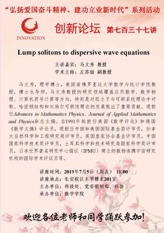 8455威尼斯官方网站创新论坛第七百三十七讲:Lump solitons to dispersive wave equations